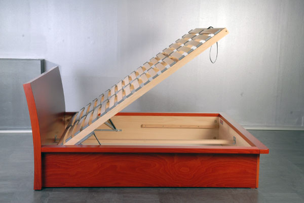 Podizanje i spuštanje podnice omogućuje okov s plinskim amortizerom. Stranice kreveta odignute su od poda na nogicama visine 1,5cm i to radi normalnog odzračivanja i mogućnosti cirkulacije zraka unutar sanduka. Iz istog su razloga na dnu kutije za posteljinu šupljikave isofaser ploče. Krevet se po želji može naručiti i bez podizne podnice odnosno s nekim od standardnih podnica iz našeg asortimana.